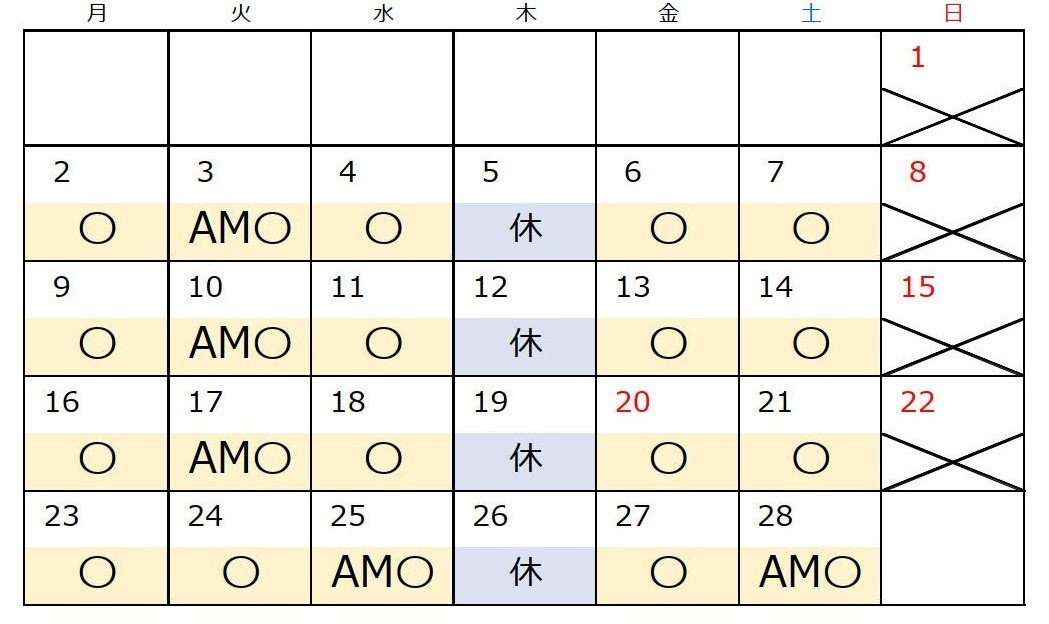 日曜・木曜、第1・2・3火曜午後、第4水曜午後