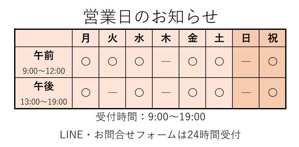 受付時間:9:00~19:00(日曜・木曜を除く)